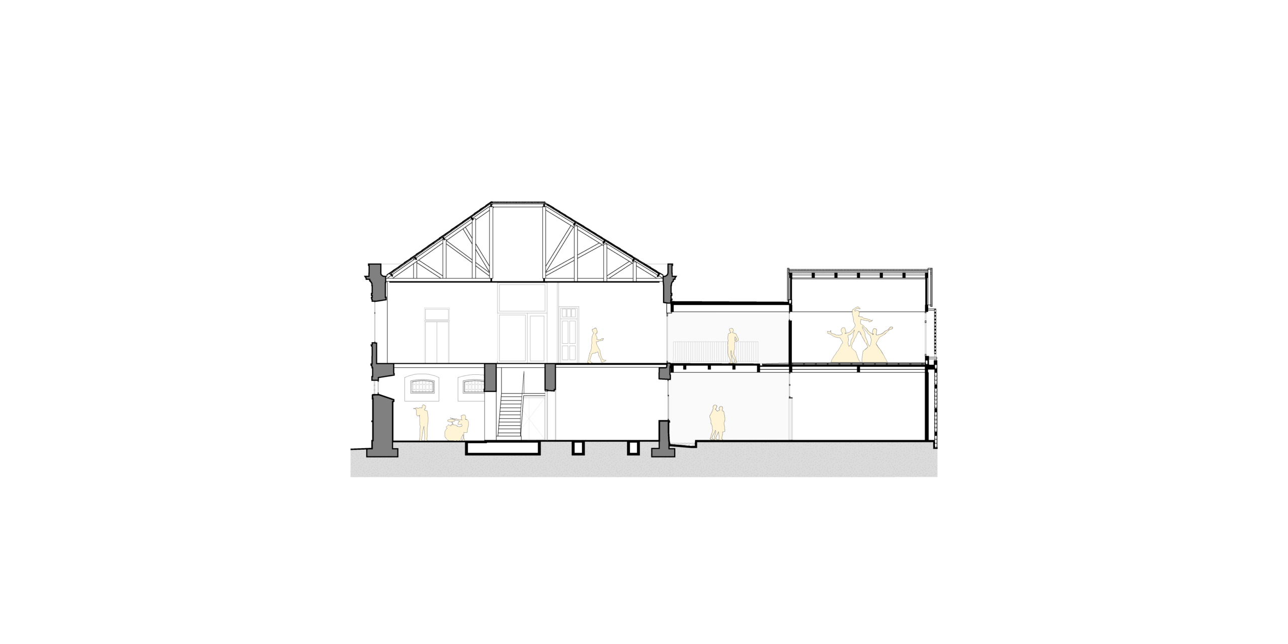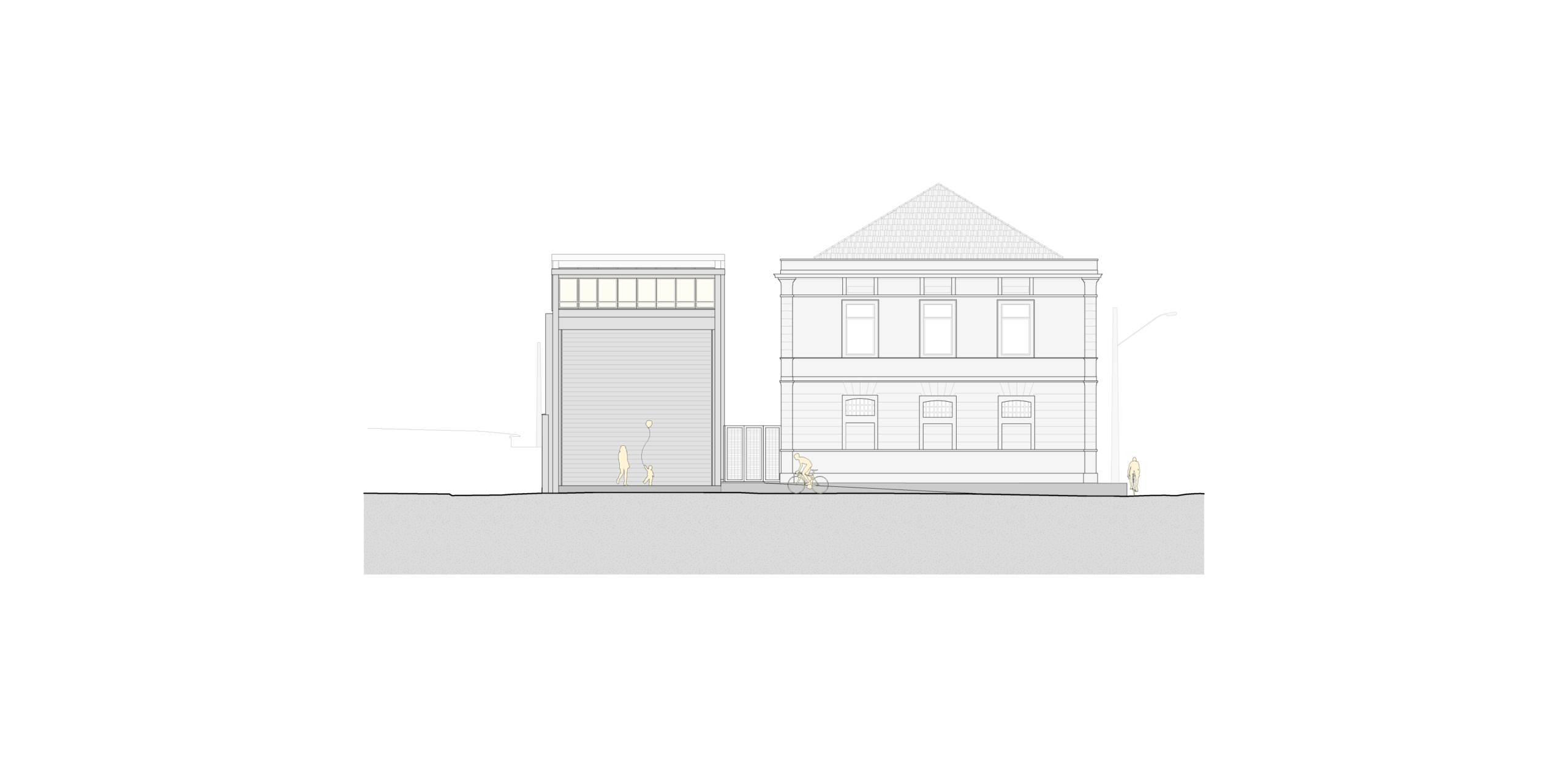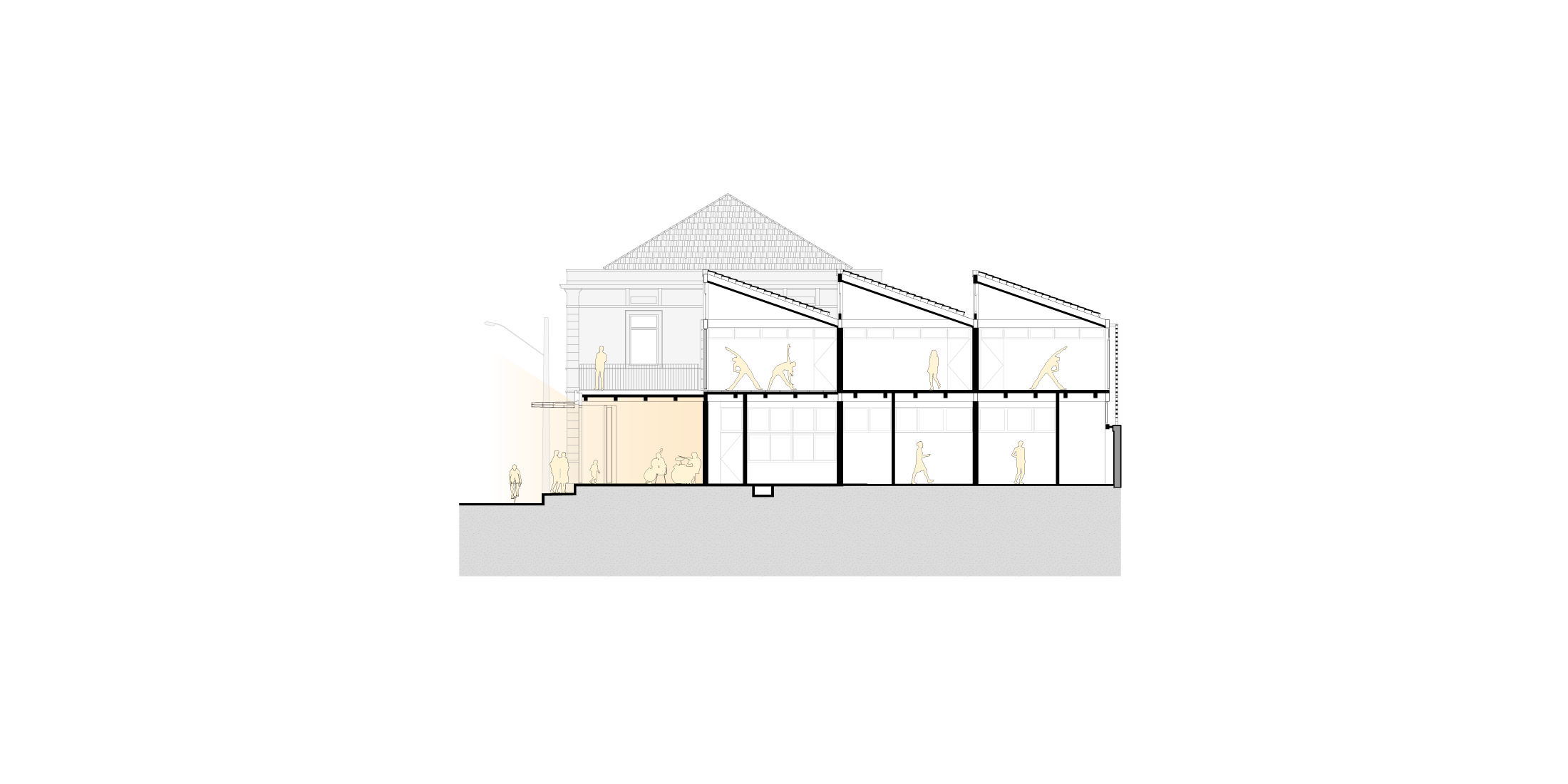 Junto à Rua XV de Novembro o segundo pavimento do anexo é recuado, garantindo a preservação da volumetria da quadra ao longo desse eixo. O nível térreo se prolonga até a divisa frontal e cria, por meio de duas inflexões em planta, um pequeno alargamento do passeio que marca o endereço e convida ao acesso. Este volume abriga a Sala de Música, que se abre inteiramente para a calçada nos dias de apresentação externa e nas tradicionais festas de rua.