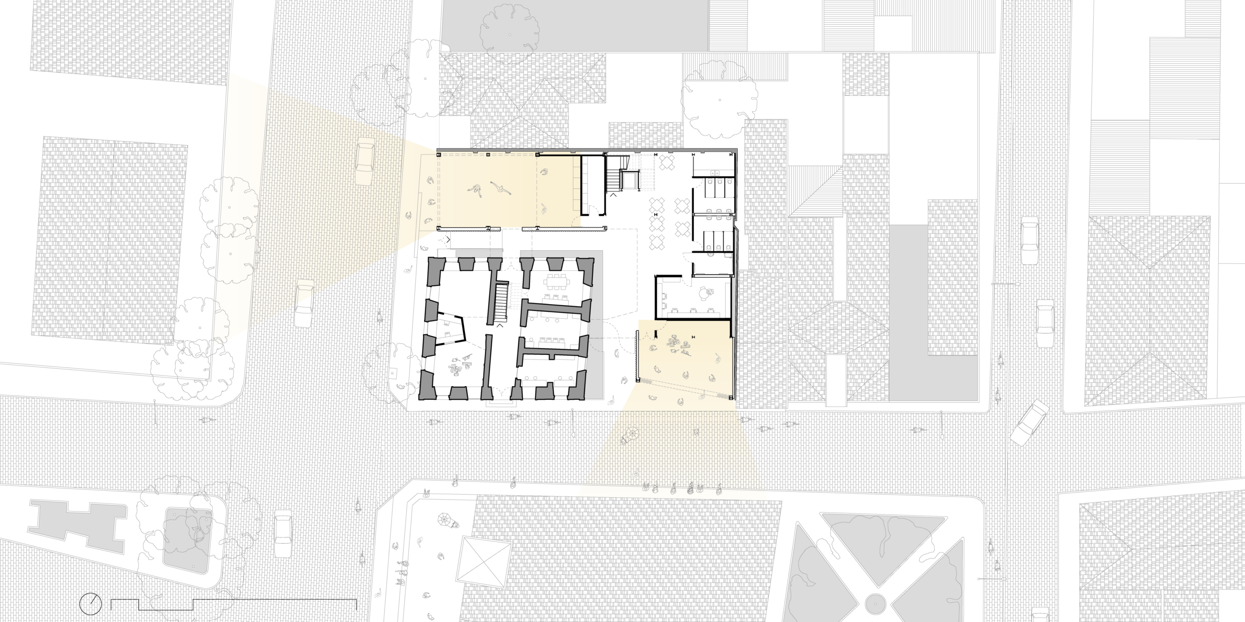 No âmbito urbano, o novo edifício busca dialogar com a cidade através de todas as suas faces externas, criando inúmeras “frentes” e nunca um “fundo”. E cada frente, ou fachada, recebe um tratamento específico, que responde às particularidades de cada situação. As faces do segundo pavimento voltadas para os lotes vizinhos evitam configurar as típicas empenas cegas que desqualificam o entorno. Ao invés disso, se apresentam como superfícies vazadas, translúcidas, que aproveitam a ventilação e iluminação naturais que se oferecem.